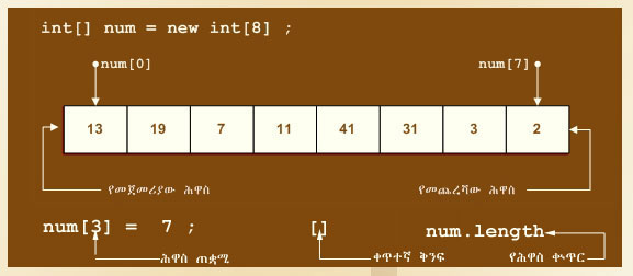 6.6 ማንኛውም ኧሬይ የመደብ ርባታ (object) ነውበጃቫ ቋንቋ፥ ማንኛውም ኧሬይ የመደብ ርቢ (object) ነው። ይህ ከሌላ የፕሮግራም ቋንቋ ለምንመጣ አደናገሪ ሊሆን ይችላል። ነገር ግን አውነት ነው። የመደብ ዝምድናው ከObject መደብ ጋር ነው። ወደፊት እንደምናየው ማንኛውም መደብ የObject ዘር ነው። ከሱ ጋር የማይዛመድ መደብ መኖር አይችልም። ኧሬዮች የመደብ ርቢ በመሆናቸው ሁሉም የሚጋሯቸው የመላና የተውላጠ-ቃል አባላት አሏቸው። የሕዋሳት ቍጥራቸውን በlength አባል ተውላጠ-ቃል ይጠብቃሉ። የአንድ ኧሬይ መጠን (length) የሚወሰነው የእሬዩ ቦታ ሲከፈት ወይም ሲታወቅ ነው። በዛን ጊዜ የlength ይዘት የኧሬዩ መጠን ይሆናል። የlengthን ይዘት መቀየር በፍጹም አይቻልም። double[] charge = new double[9] ; ልክ ይህ ኧሬይ ሲፈጠር፥ ከሚኖሩት አባላቱ መካከል አንዱ length ከመሆኑም በላይ የእሬዩን መጠን ስንት እንደሆነ በሆድቃው ይጠብቃል። መጠኑ 9 ነው። ምንም እንኳን በObject መደብ ውስጥ ያሉትን መላዎች ማንኛውም ኧሬይ ቢወርስም፥ በተግባር ደረጃ ይኸን ያህል አያስፈልጉም። ለማንኛውም ግን መኖራቸው መረሳት የለበትም። 6.7 ባለብዙ ኧሬይ (Multidimensional array)እስካሁን ድረስ የተመለከትናቸው ኧሬዮዎች በሙሉ ባለተናጠል መስመር ናቸው። በተርታ የተደራጁ፥ ቅደም ተከተል ያላቸው፥ አንዱ ከአንዱ እንደ ሰንሰለት የተያያዙ። ተናጠል ኧሬዮዎች በተናጠል ለሚደራጁ ዴታዎች አመቺ ሆነው በሠንጠረጅ መዋቅር ለሚደራጁ ዴታዎች ግን አመቺነታቸው ይቀንሳል። በሠንጠረጅ መልክ መደራጀት ያለባቸው ዴታዎች አንድ አይነት መሆናቸው ከታወቀ፥ ባለብዙ ኧሬይ መጠቀሙ አንዱ መፍትሔ ነው። ባለብዙ ኧሬይ፥ በእንግሊዘኛ (multidimensional array)፥ በአያሌ አቅጣጫዎች ተዘርጊ ቦታ ለመፍጠር ያስችላል። ባለሠንጠረጅ ኧሬይ ሁለት አቅጣጫ አለው፤ ዓምዳዊና ረድፋዊ። ሁለት አቅጣጫ ያለው የባለብዙ ኧሬይ ቃል አወጣጥ ይኸን ይመስላል። int[][] table = new int[10][10] ; ኧሬዩ ስንት አቅጣጫዎች እንዳሉት ወሳኙ የ[] ቍጥር ነው። በዚህ ምሳሌ ሁለት ቀጥተኛ ቅንፎች አሉን፤ በመሆኑም table ባለሁለት አቅጣጫ ኧሬይ ይሆናል። በስተቀኝ በኩል ያለው 10 በ 10 የተባዛ ቦታ ይፈጥራል። በአጠቃላይ የሕዋሳቱ ቍጥር 100 ነው። እነዚህን ሕዋሳት ማየት የሚቻለው አንድ በአንድ ሲሆን ቃል አገባቡ ይኸን ይመስላል። table[0][9] = 12 ;
