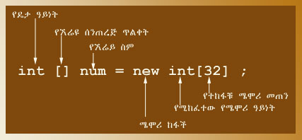 6.2 የኧሬይ ዓይነት ሲሉየዴታ ቍጥር እየበዛ ሲመጣ፥ ማጠናቀሩ፥ ማደራጀቱ፥ እንዲሁም ልዩ ልዩ ተግባራትን መፈጸሙ፥ ስልታዊ የሜሞሪ አያያዝና አጠቃቀም ይጠይቃል። ሜሞሪን ከምናደራጅበት መንገዶች መካከል አንዱ ኧሬይ ነው። ኧሬይ ስንል፥ ተመሳሳይ የዴታ ዓይነት ያላቸው፥ በአንድ ስም የተወከሉና፥ በተርታ የተደራጁ የሜሞሪ ክፍሎችን ነው። ይህ አባባል፥ የጃቫን ኧሬይ መሠረታዊ ባሕሪያት በሙሉ አይጠቀልልም፤ ግን አጠቃላይ መንፈሱን ያንጸባርቃል። የቀረውን ወደፊት እንደርስበታለን። ለእንደ ሲ (C) ላሉት ቋንቋዎች ግን አባበሉ ከእውነት አይርቅም። የኧሬይ ሥዕላዊ መልኩ ይኸን ይመስላል።