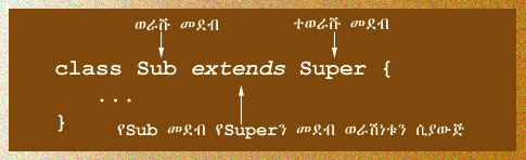 8.2 መግቢያበፕሮግራም ዓለም ውስጥ ጊዜ ከምናባክንባቸው አንዱ፥ ለተናጠል መፍትሔዎች በተደጋጋሚ የምንጽፈው ኮድ ነው። ይህ የጠና ችግር ከመሆኑ የተነሳ አያሌ መፍትሔ ነክ መንገዶች በየጊዜው ይቀርባሉ። በመደባዊ የፕሮግራም ቋንቋዎች በኩል ይኸን ችግር ለመቀነስ ይረዳ ዘንድ አንድ መደብ ሌላውን ወርሶ የባለቤትነት መብት እንዲኖረው ይፈቅዳሉ። በአሁኑ ጊዜ፥ ተግባራዊ ፕሮግራም እንጻፍ ካልን፥ በቀጥታም ሆነ በተዘዋዋሪ መንገድ፥ በሌሎች ፕሮግራሞች ላይ መመካቱ አይቀርም። በአያሌ ሁኔታዎች ውስጥ፥ ከውጭ የሚመጡ መደቦችን እንድንወርስ እንገደዳለን። ለዚህ በቂ ምሳሌ ይሆን ዘንድ የጃቫ ሰርቭለት ኤ/ፒ/አይ (Java Servlet API) እንጥቀስ። ይህ ኤ/ፒ/አይ ለዌብ (web) በቀላል መንገድ ፕሮግራም የምንጽፍበት አካባቢ ነው። በግል እንጻፍ ብንል ወራት ወይም ዓመታት ሊወስዱብን የሚችሉ ሥራዎችን በነፃ ይለግሰናል። ሌሎችም ምክንያቶችም አሉ። ኤ/ፒ/አይ ራሱን የሚለግሰው ተጠቃሚው መደብ የHttpServlet መደብን እንዲወርስ በማስገደድ ነው። ራሱን ተወራሽ በማድረግ ከተጠቃሚው መደብ ጋር ባለበቴነትን እንደመጋራት። ከዚህ የምንገነዘበው፥ በአንዳንድ ሁኔታዎች ውስጥ የተሰጠን መደብ ሳንወርስ በቀላሉ ፕሮግራም መጻፍ እንደማንችል ነው። የመደብ ዝምድና ጥቅም በዚህ ብቻ አይወሰንም። በቡድን ፕሮግራሞችን ለመጻፍ ቀጥሎ ለመገንባት ማለትም ንድፎችን በመልክ ከፋፍሎ፥ ድርሻዎችን ለያንዳንዱ የቡድን አባል ደልድሎ፥ በተናጠል ኮዶችን ጽፎና ፈትኖ፥ በመጨረሻ ሁሉንም በአንድ አደራጅቶ የመጨራሻውን ፕሮግራም ለማውጣት እጅግ አመቺ ነው። 8.3 መደባትን በውርስ ማዛመድበሁለት መደቦች መካከል ዝምድና ከምንፈጥርባቸው መንገዶች አንዱ ውርስ ነው። በዚህ ዝምድና አንደኛው መደብ ወራሽ፥ ሌላኛው አውራሽ ይሆናሉ። ወራሹ መደብ ሁልጊዜ ዝምድናውን የመመሥረት ኃላፊነት አለበት። በሂደቱ፥ ተወራሹ መደብ ምንም ዓይነት እርምጃ መውሰድ የለበትም። ዝምድናው፥ ወራሽ መደብን የተወራሹን ተውላጠ-ቃላት፥ መላዎች፥ እንዲሁም ውስጣዊ መደቦች በቀጥታ ማየትና እንደራሱ አድርጐ የመጠቀም መብት ይሰጠዋል። ተወራሹ የግል (private) ብሎ የሰየማቸው አባላት ግን በፍጹም ማየት ወይም መንካት አይችልም። በprivate ፍቃድ ሥር ያሉ የመደብ አባላት ከባለቤታቸው ክልል ውጭ አይታዩም። ለወራሽ መደብ ጨምሮ። አንድ መደብ ሌላ መደብ እንዲወርስ ከተፈለገ፥ በመደቡ ድንጋጌ ጊዜ የextendsን ቃል በመጠቀም ዝምድናውን እንመሠርታለን። አጻጻፉ እነሆ፦