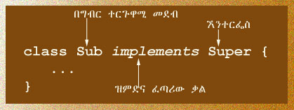 8.5 ጃቫ ኧንተርፌስ (Java Interface)የጃቫ ኧንተርፌሶች ከመደብ ጋር ይመሳሰላሉ፥ ነገር ግን ማቀፍ በሚችሏቸው አባላት ጥብቅ መሠረታዊ ይለያሉ። በራሳቸው የመቆም ወይም የመንቀሳቀስ ብቃት የላቸውም። አባሎቻቸው፥ የመላ አዋጆች፥ ቋሚና ኧስታቲክ ተውላጠ-ቃላት ናቸው። የመላ አዋጅ ስንል፥ ድንጋጌ የሌለው፥ በድርብ-ሰረዝ (;) የተቋጨ የመላ ራስጌ ማለታችን ነው። አባሎቻቸው ሁልጊዜ ገሀድና ለማንኛውም የውጭ መደብ ሆነ ኧንተርፌስ ከፍት ናቸው። ኧንተርፌሶች ለዝምድና ሁልጊዜ ዝግጁዎች ናቸው። ተፈጥሯዊ ባሕሪያቸው እንዲሉ። ሌላ መደብ ወስዶ ተግባራዊ ካላደረጋቸው፥ በፍጹም ዋጋ የላቸውም። አብይ ዓላማቸው፥ በማይተዋወቁ መደቦች፥ እንዲሁም ፕሮግራሞች መካከል ድልድይ መፍጠር ነው። የጃቫ ኤ/ፒ/አይ ለዚህ በከፍተኛ ደረጃ ይገለገላቸዋል። የኧንተርፌስ ዝምድና ቃል አገባብ፦