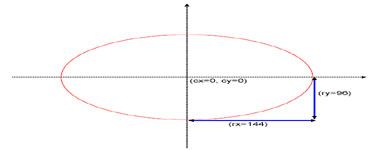 3.4 ኢልፕስ (Ellipse)ኢልፕስ የክብ ዘር ነው። ሁለት አራት ማእዘን ሠርተው የሚያልፉ አክሰሶች እምብርቱ ላይ አሉት። የኢልፕሱን ሰፊ ጐን መሥራች «አብይ አክሰስ»፥ የኢልፕሱን ጠባብ ጐን መሥራች «ንኡስ አክሰስ» ብለን እንጠራዋለን። በተለምዶ፥ አብዩ-አክሰስ በ2a፥ ንኡሱ-አክሰስ በ2b ይወከላሉ። ለማስታወስ ያህል፥ ሁለቱ ከጫፍ እስከ ጫፍ ያላቸው ርቀት አንድ ዓይነት ከሆነ ኢልፕሱ ክብ ይሆናል። የሚከተለው ሥዕላዊ ገለጻ በጠቅታ እነሆ።
